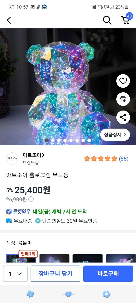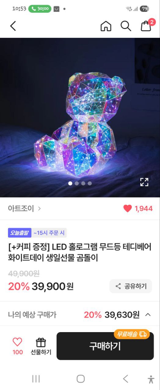 아트조이 판매처에서 LED 홀로그램 무드등 테디베어 화이트데이 생일선물 곰돌이를 선택했습니다.