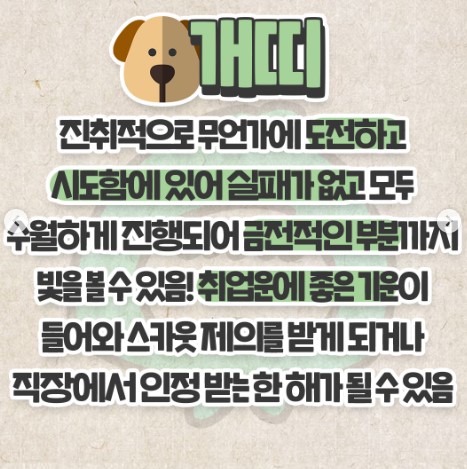 2위는 개띠입니다. 재물이 쌓이는 해라고 생각하면 될것같습니다. 보너스, 직장승진, 투자수익 자산관리에 집중을 한다면 큰 이익을 얻을수 있습니다.