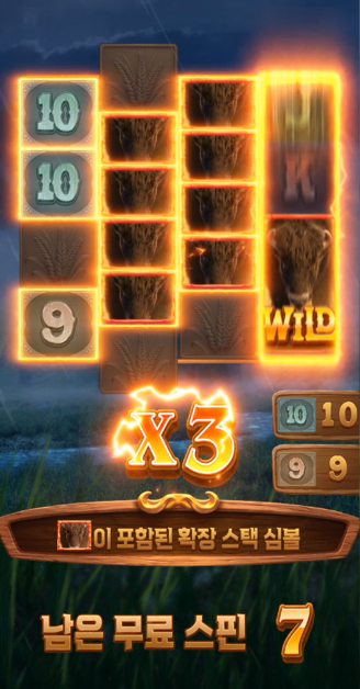 와 씨... 확장 스택 심볼 터지는 거 보임? 배수 x3에다가 버팔로 꽉 차니까 눈 돌아가네. 아직 무료 스핀 7번이나 남음ㅋㅋㅋ 제발 끝까지 이 텐션 유지해줘라 버팔로야!