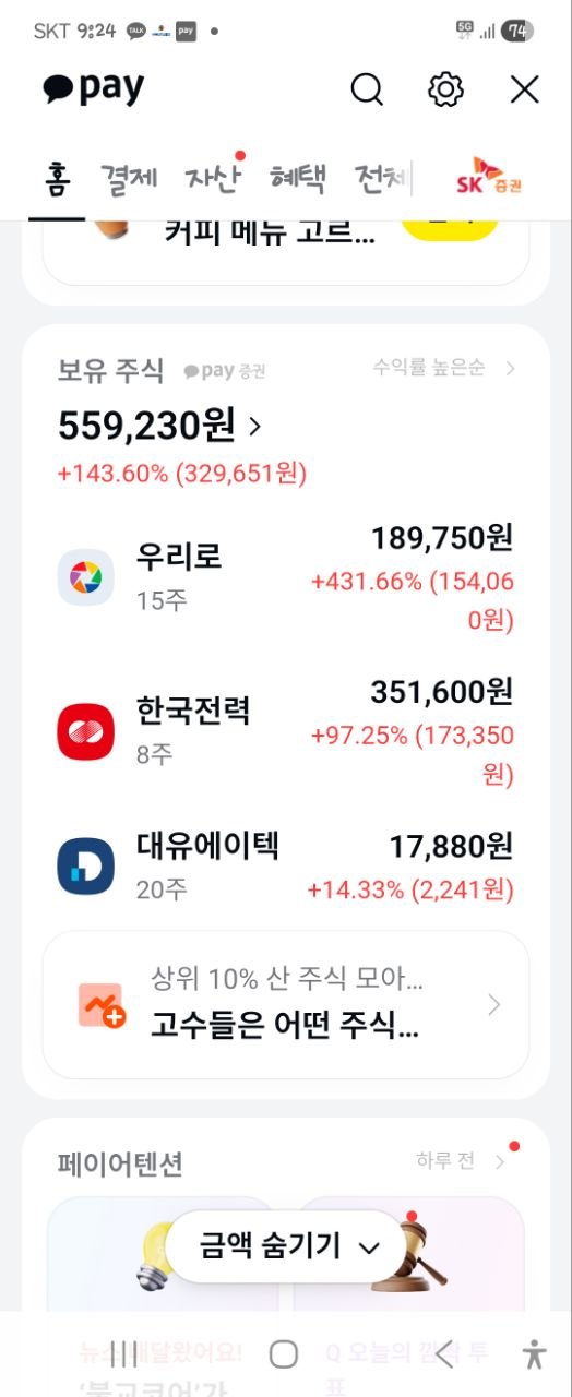 와이프가 2년전에 카카오톡 주식에서 일부 추천으로 우리로 한국전력 대유에이텍등을